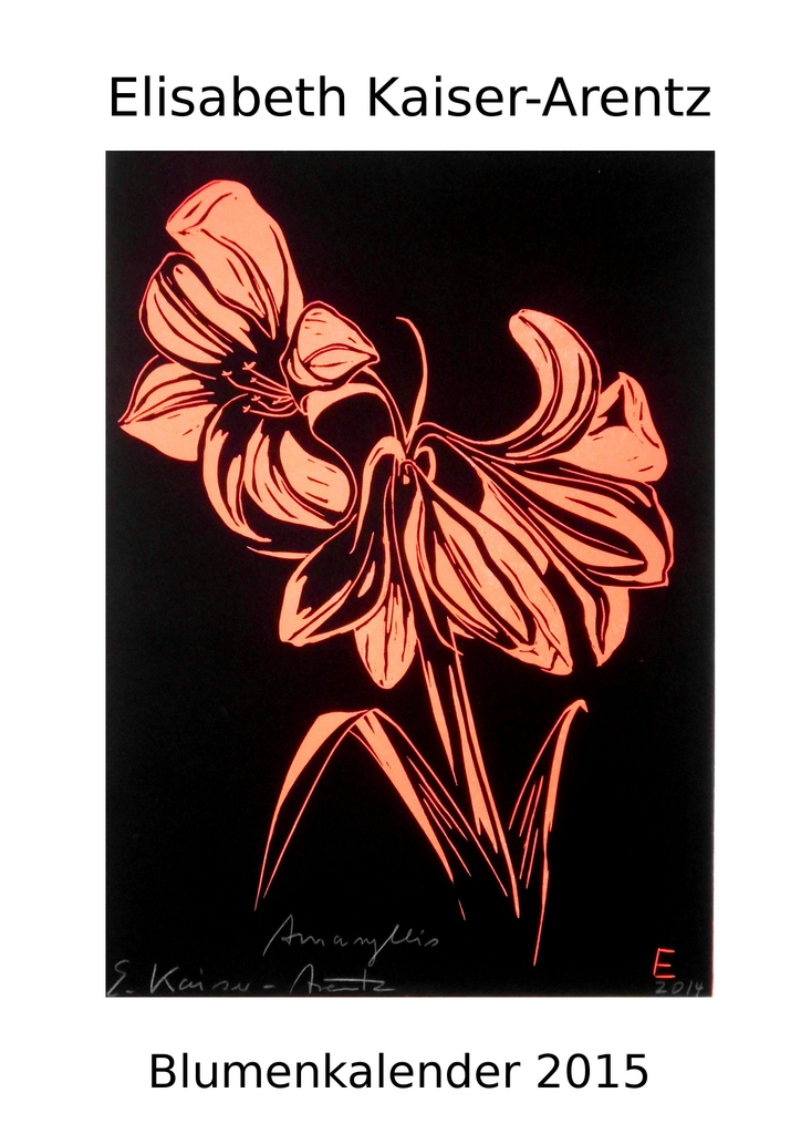 In 2014 hat Elisabeth eine ganze Reihe von Linolschnitten angefertigt, auf denen Blumen zu sehen sind. Wie bereits bei “Schnittblumen” gezeigt, sind verschiedene Blumen in dieser Technik entstanden. Daraus ist ein “Blumenkalender mit 12 Monatsseiten entstanden. Das Deckblatt ist hier zu sehen:
